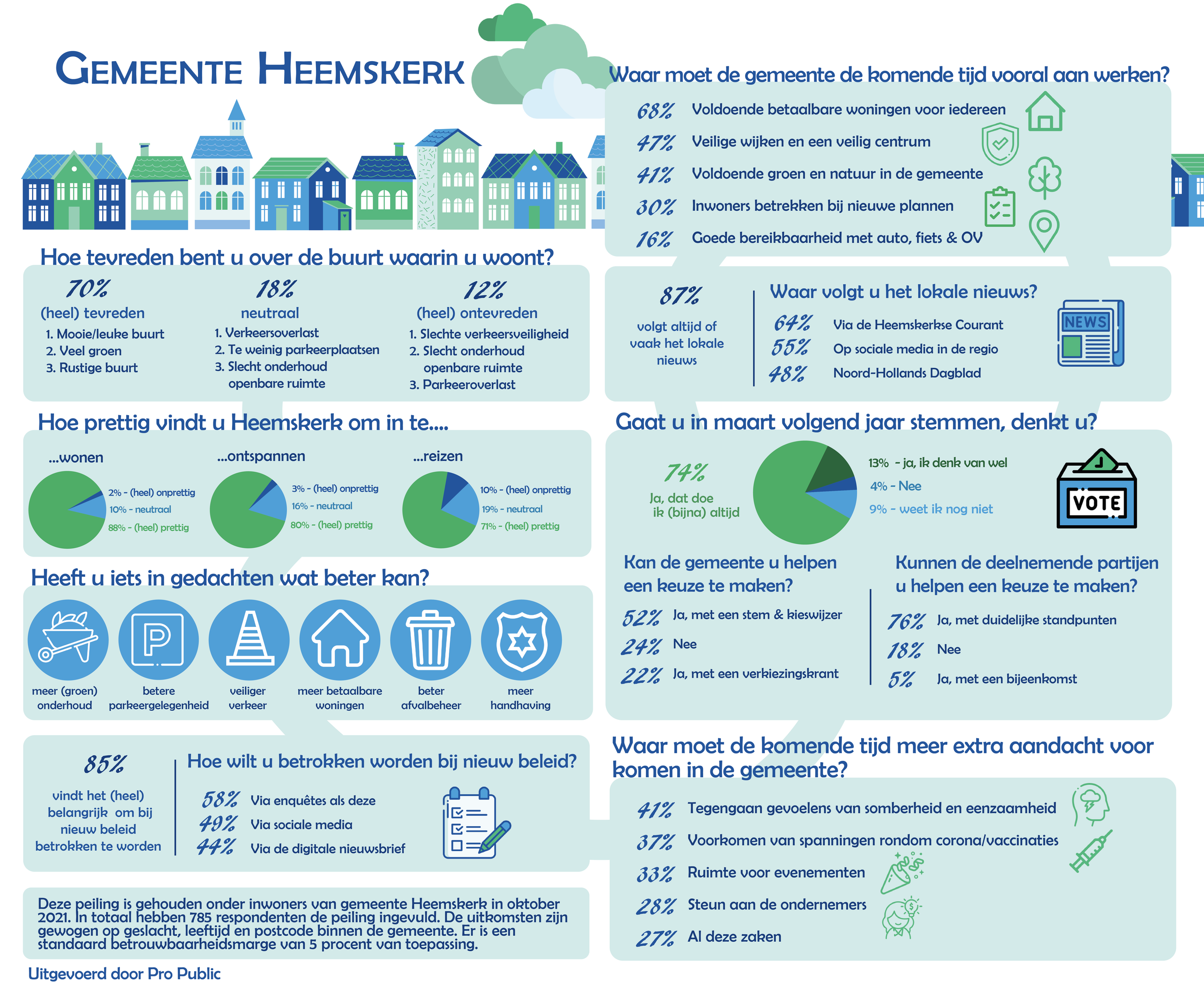 Om de resultaten terug te koppelen aan inwoners maken we een infographic. Iedereen ziet in één oogopslag wat er leeft bij de bevolking. Bijvoorbeeld: